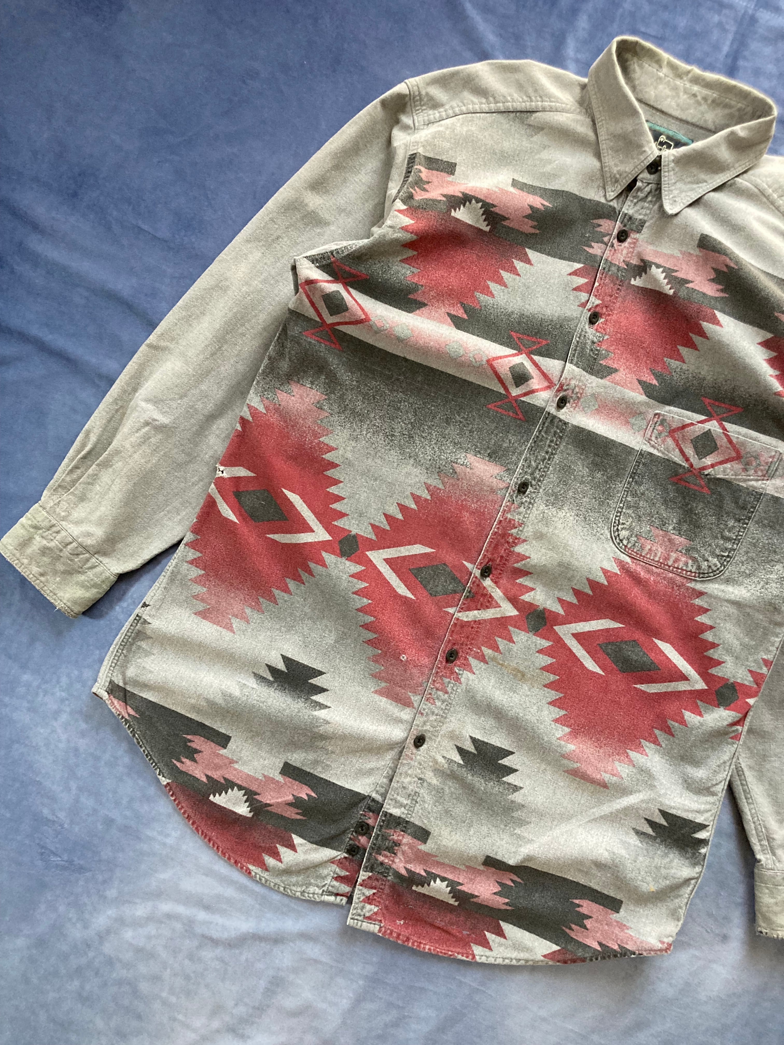 USA製のウールリッチの人気の高いネイティブ柄の長袖シャツ。カラーリングも良くサイズもUSAのLでゆったり着用できます。